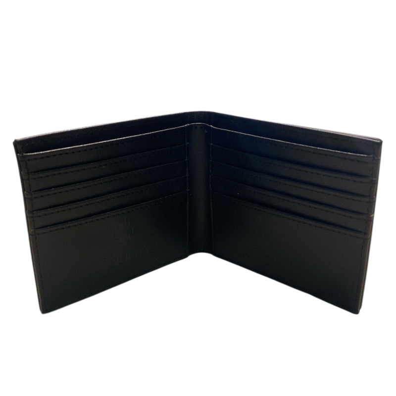 Grande scomparto per contanti e 8 piccole tasche per carte o documenti.