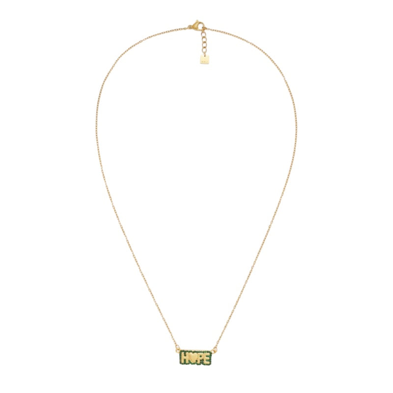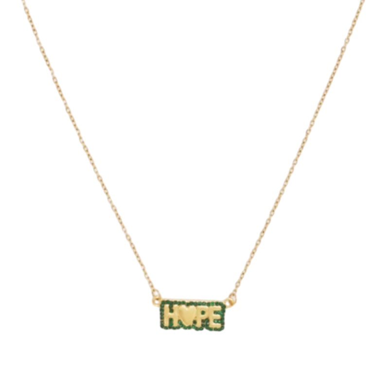 Collana a girocollo con pendente Hope con piccole pietre verdi applicate.