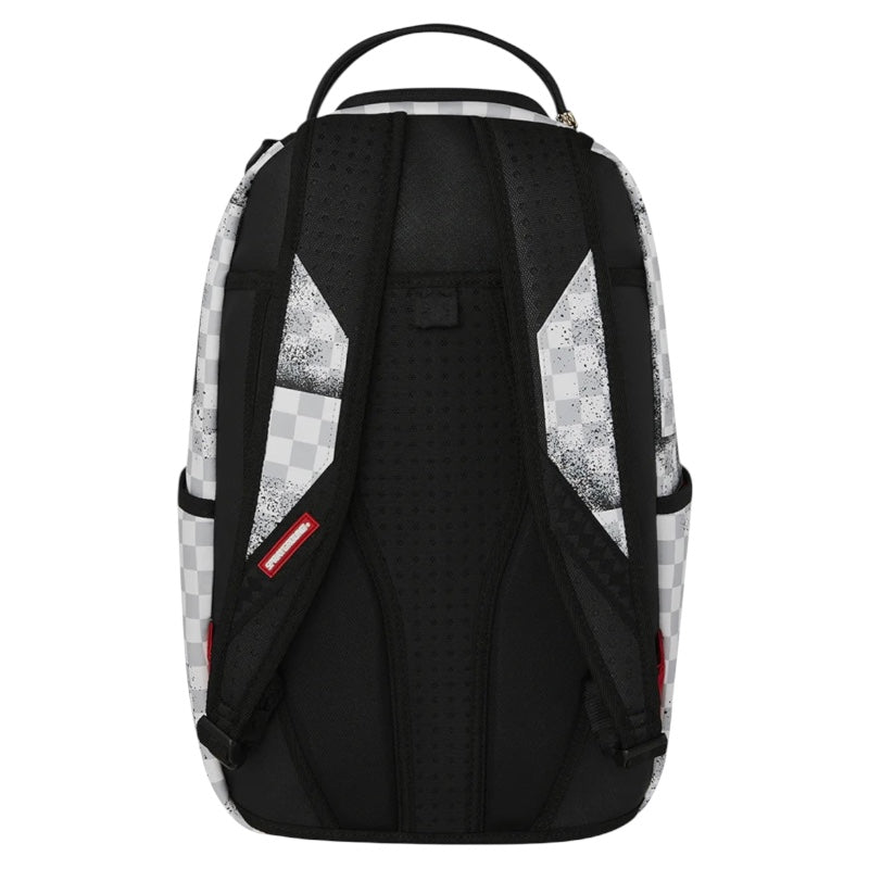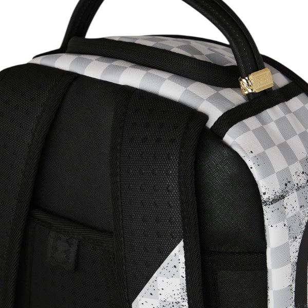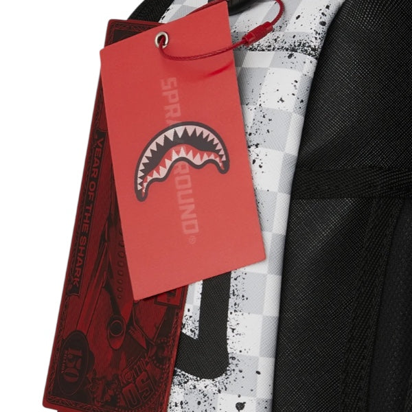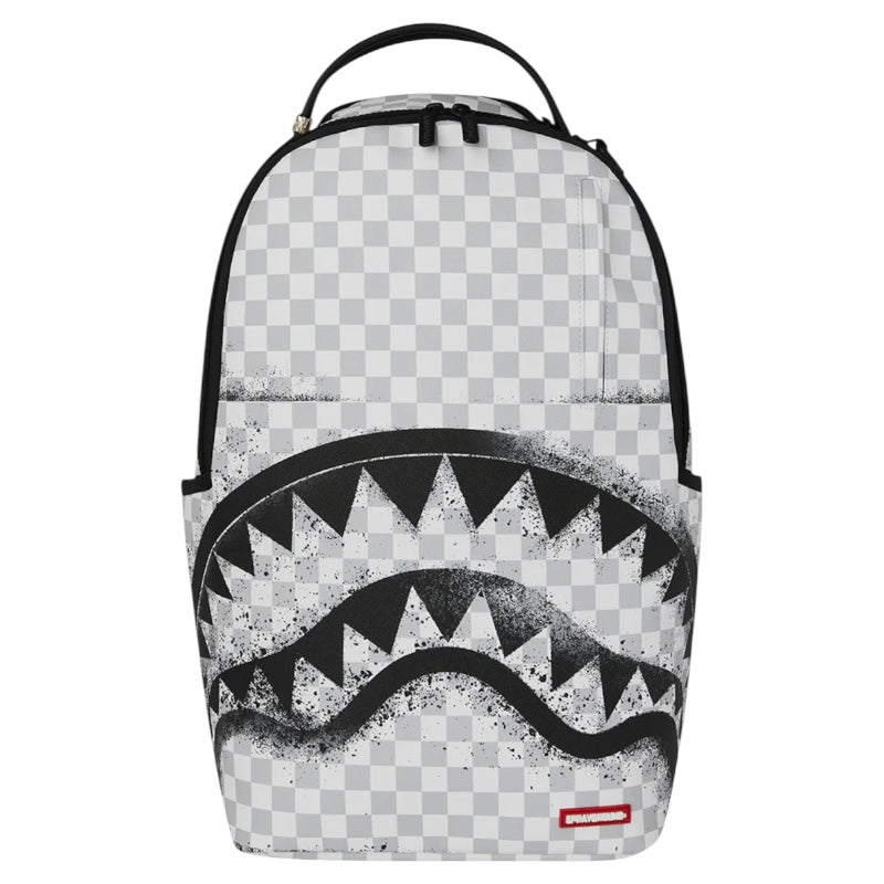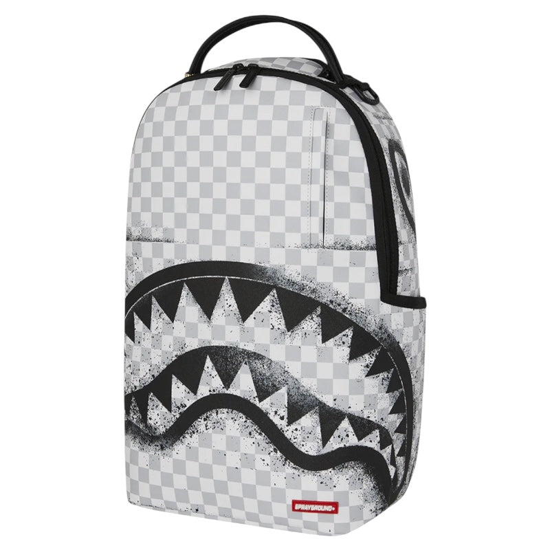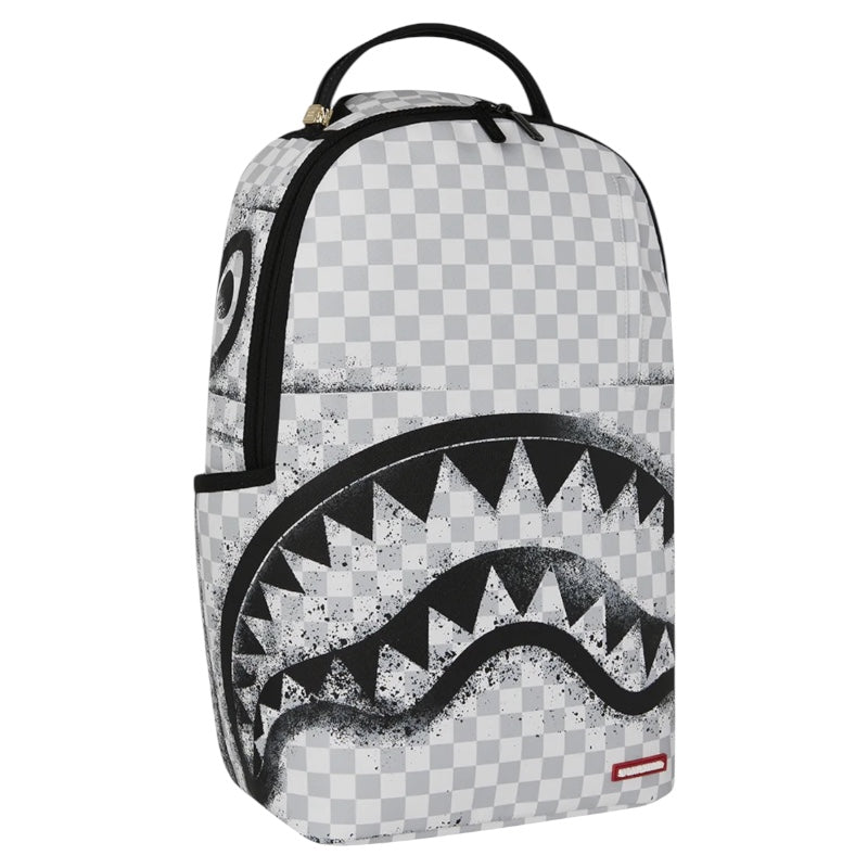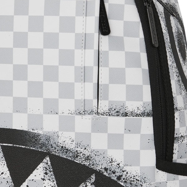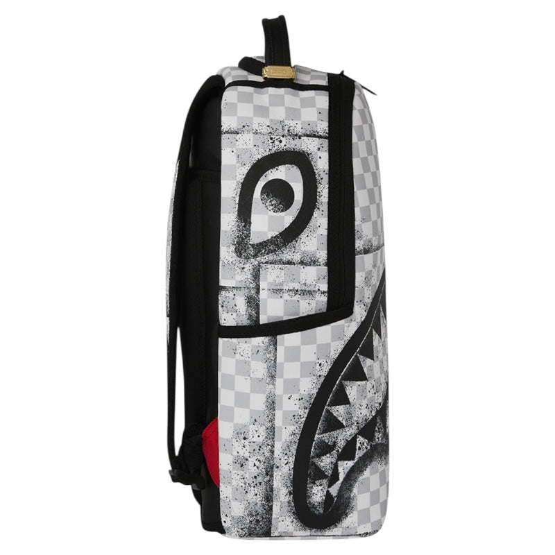 Zaino in fantasia check a quadretti grigi e bianchi, occhie e bocca di squalo effetto graffiti nere a contrastro.