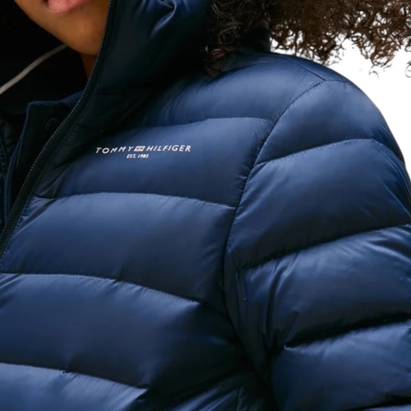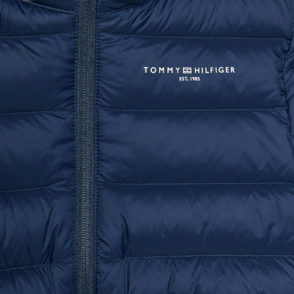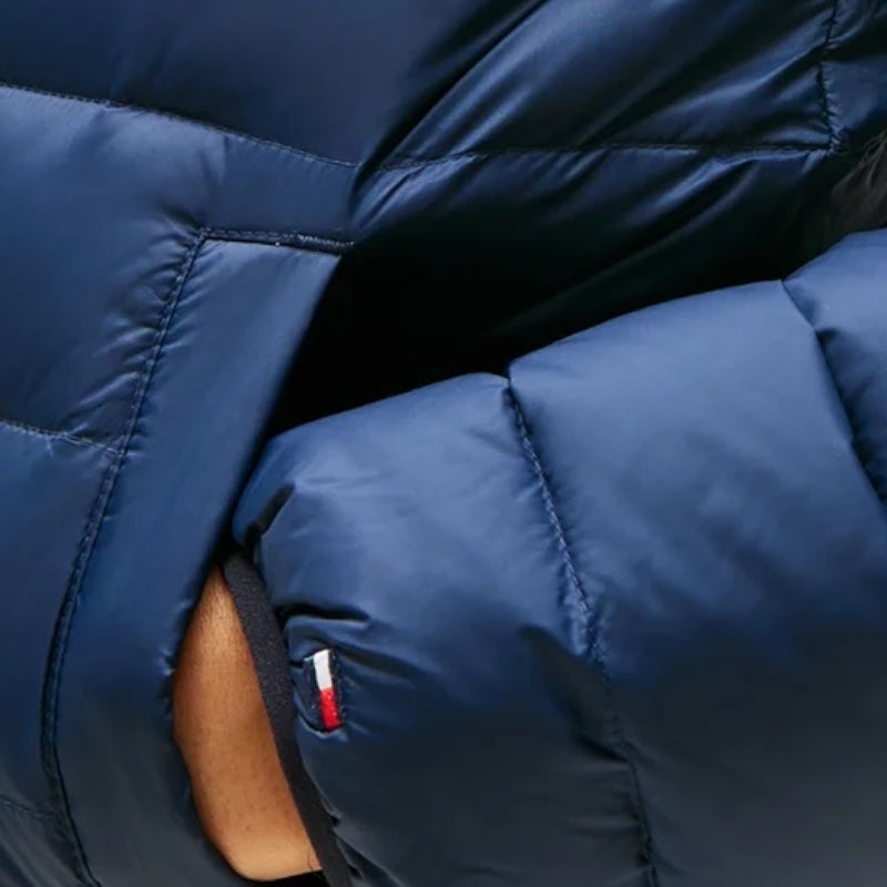 Logo Tommy Hilfiger bianco a lato. Aperto davanti, chisura con cerniera loggata e tasche laterali a filo con bottoncino.