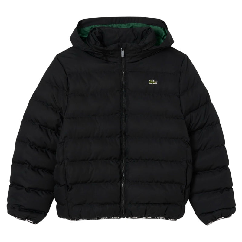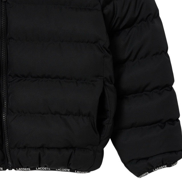Cappuccio in tessuto tecnico leggero estraibile tramile la cerniera nel colletto.