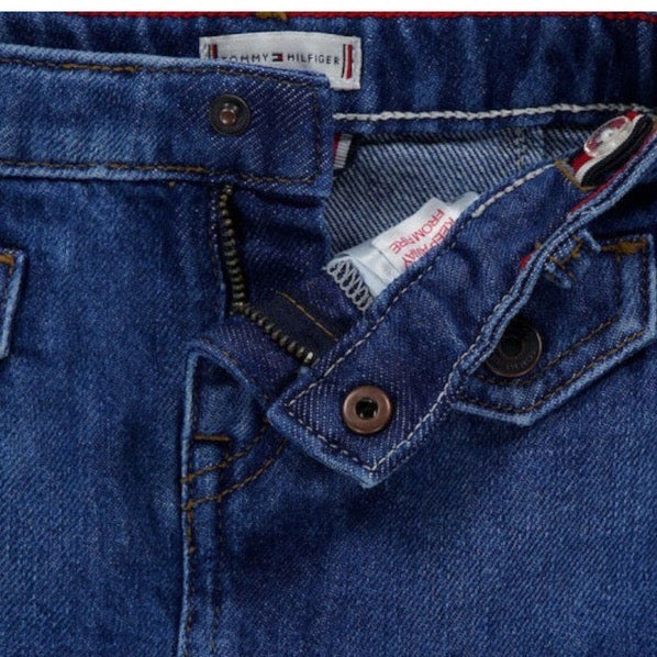 Doppia tasca davanti con bottoni. Tasche posteriori con bandierina Tommy ricamata.