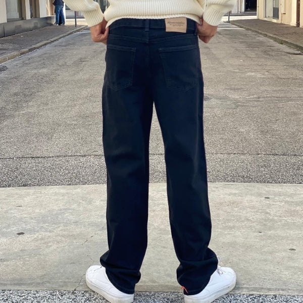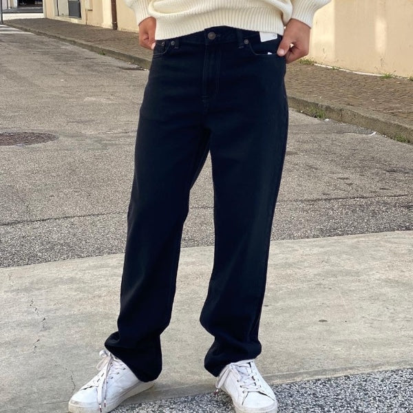 Modello dalla vestibilità baggy, vita bassa e gamba larga che rimane dritta sul fondo.