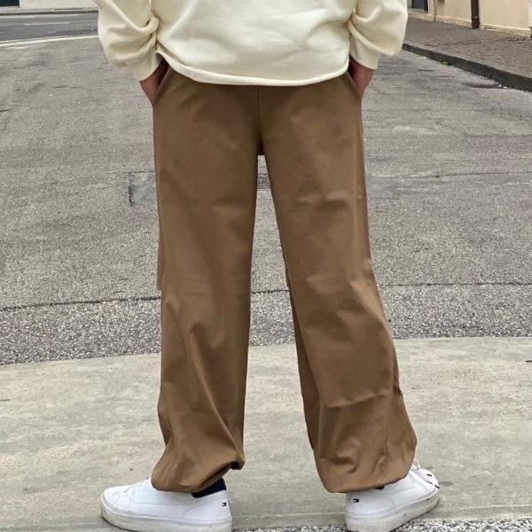 Pantalone dalla gamba morbida, che stringe sul fondo grazie all'elastico.