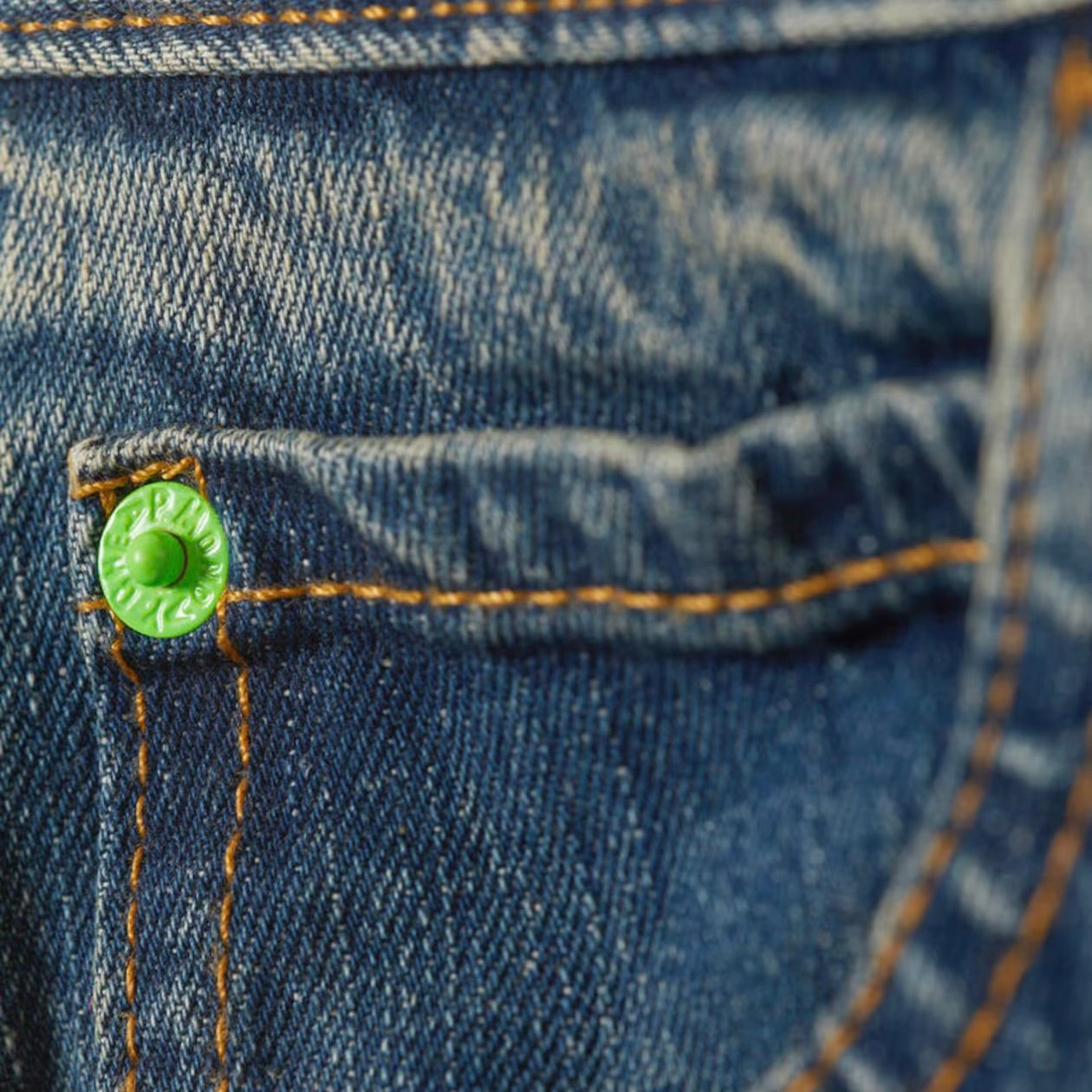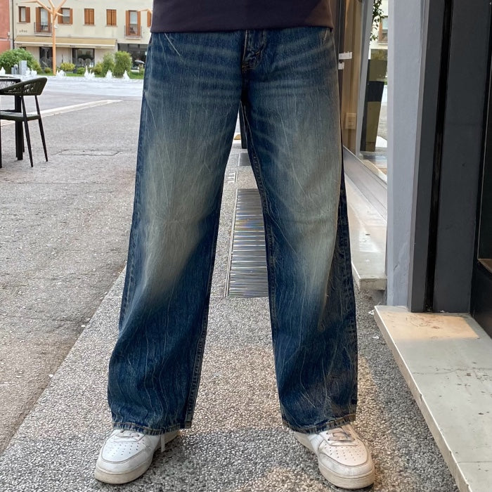 Lavaggio del jeans blu medio, con baffature, striature e schiariture cromatiche per dare un effetto vintage al capo.