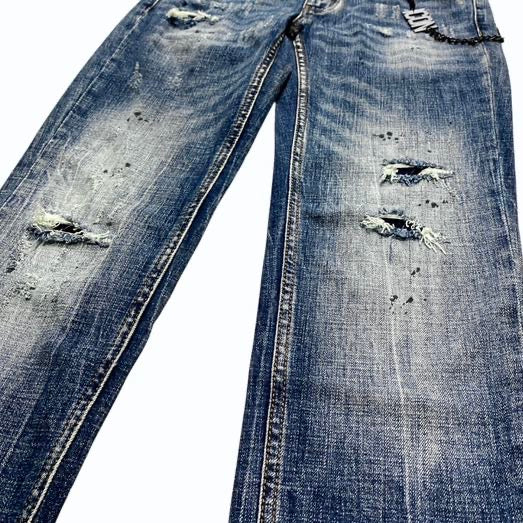 Strappi, abrasioni e macchie di colore realizzate in tutto il capo.