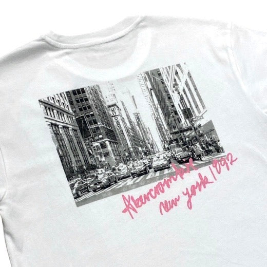 Logo Abercrombie & Fitch con glitter e grafica New York in piccolo davanti e in grande nel retro.