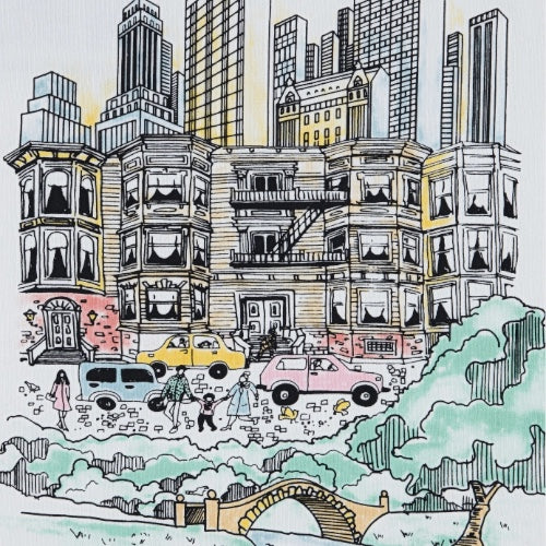 Logo Abercrobie e grafica con città "stilizzata" in piccolo davanti e in grande nel retro.