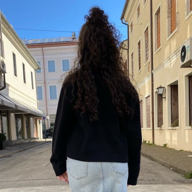 Realizzato in misto cotone con lavorazione a coste verticali davanti e dietro, e a manica rasata sulle maniche.