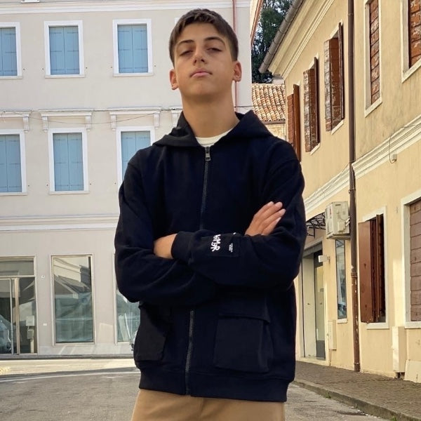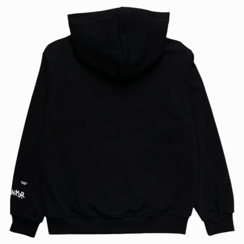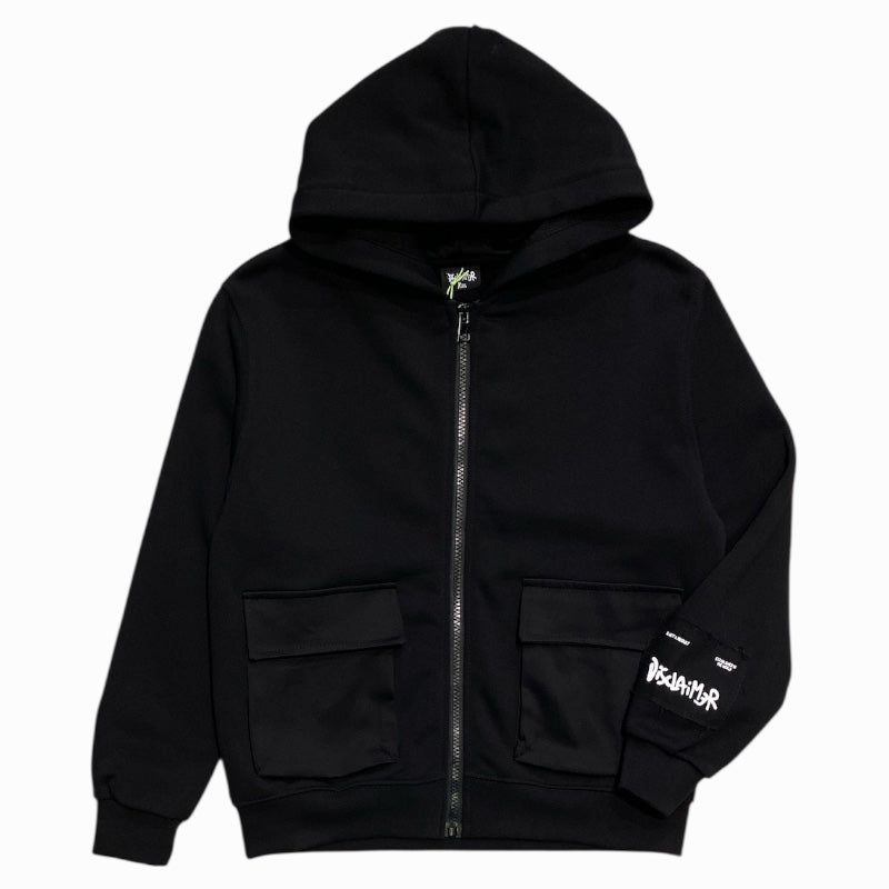 Disclaimer kids felpa nera a con zip e cappuccio aperta davanti, da ragazzo.