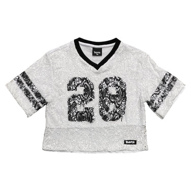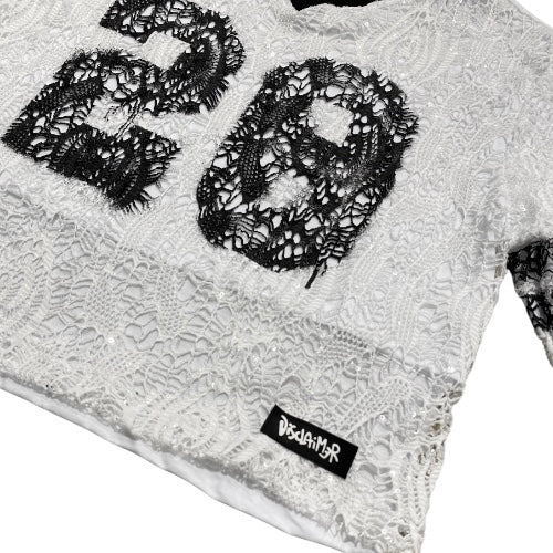 Capo che richiama la cultura del football americano con lo scollo a V a contrasto, numero 28 e doppia fascia nera sulle maniche. Logo Disclaimer gommato cucito sul fondo.