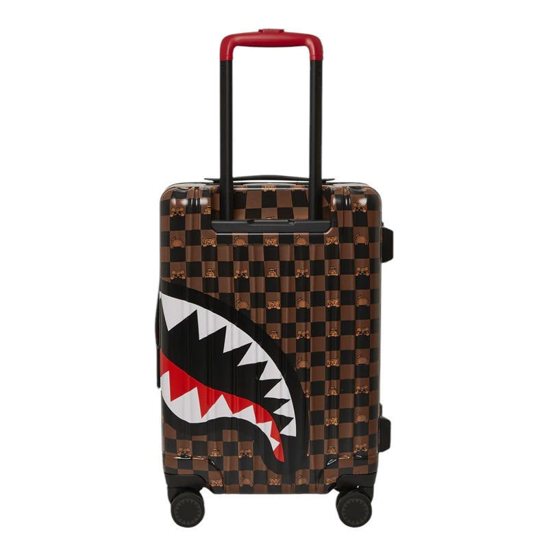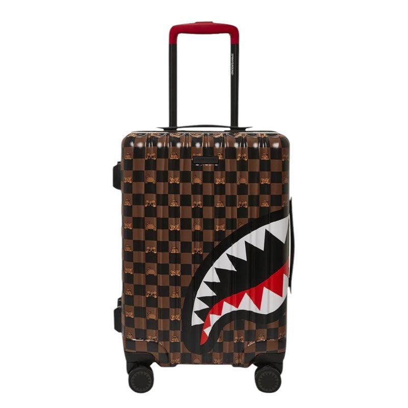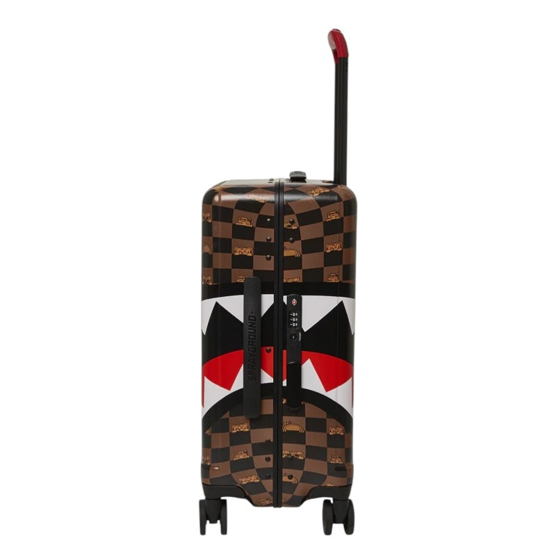 Valigia trolley in fantasia check a quadretti marroni e neri, con personaggi Sprayground all over sul pattern.